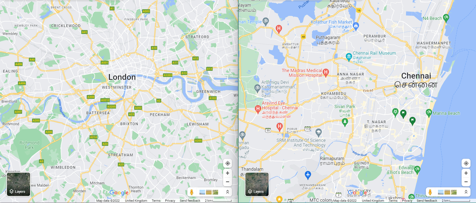 #30 So many parks. London has 2.7x more parks per 1000 people than Chennai has. It might not seem like a big deal when you just look at the number. But you see how drastic the difference is when you juxtapose the terrain of the two places in google maps: